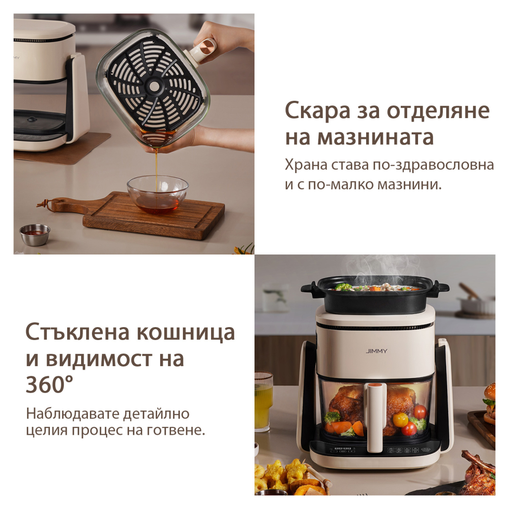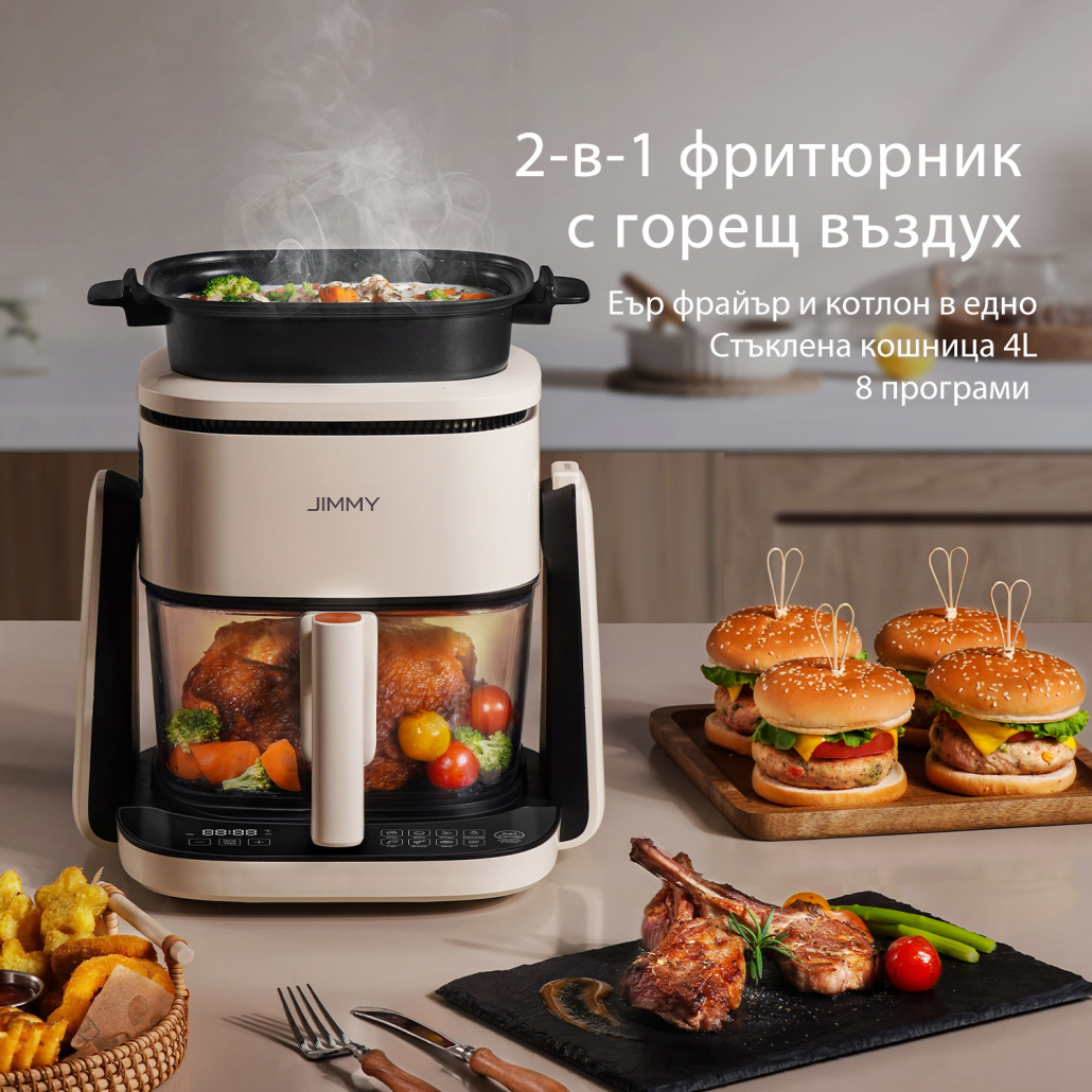 Еър фрайърът Jimmy AF3 е страхотно попълнение в кухнята. Благодарение на функцията си за бързо трансформиране в котлон, можете лесно и бързо да приготвите различни ястия, по различен начин само с един уред. Стъклената кошница позволява здравословно готвене, както и пълно наблюдение на целия процес. Не изпускайте нито момент от приготвянето на любимите си ястия.