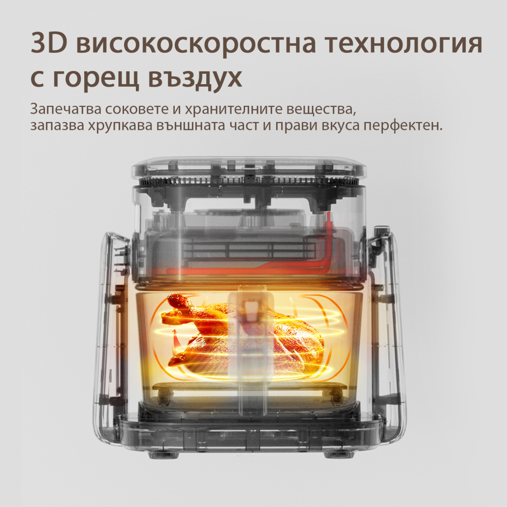 360 ° високоскоростна циркулация на горещ въздух, триизмерна конвекция, така че съдът да се нагрява равномерно,  благодарение на което се запечатат соковете и хранителните вещества, запазва се хрупкавата външна част, което прави вкуса перфектен.