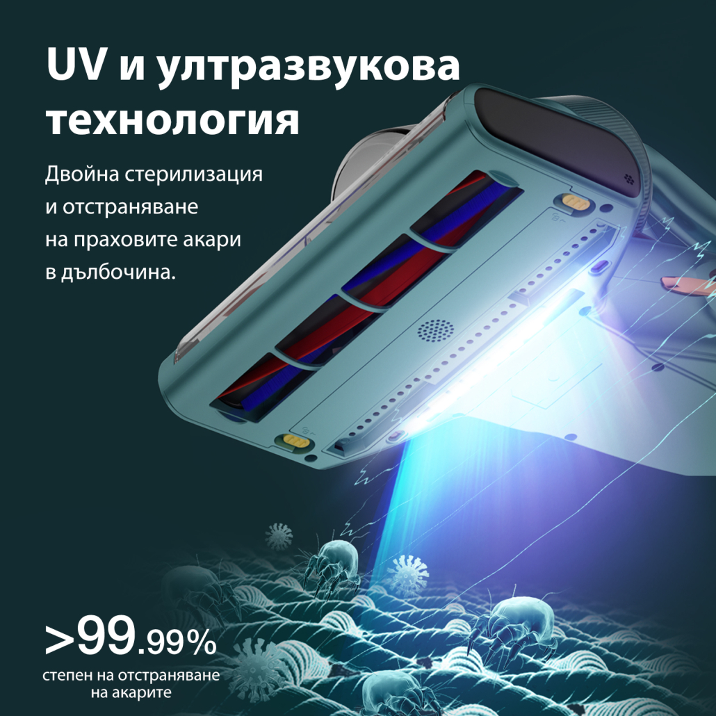 Благодарение на иновативната технология за UV стерилизация, BX7 Pro елиминира прах, акари и бактерии в дълбочина. Прахосмукачката излъчва ултравиолетови вълни с дължина от 253 nm, които унищожават 99,99% от праховите акари.