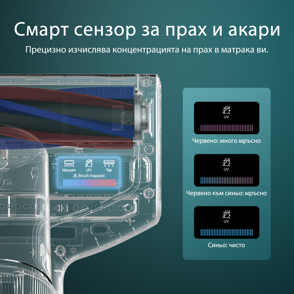 Интелигентният сензор изчислява с висока точност количеството прах и прахови акари в дадена зона. Червена светлина индикира високо замърсяване, а синята показва  перфектно почистена повърхност.