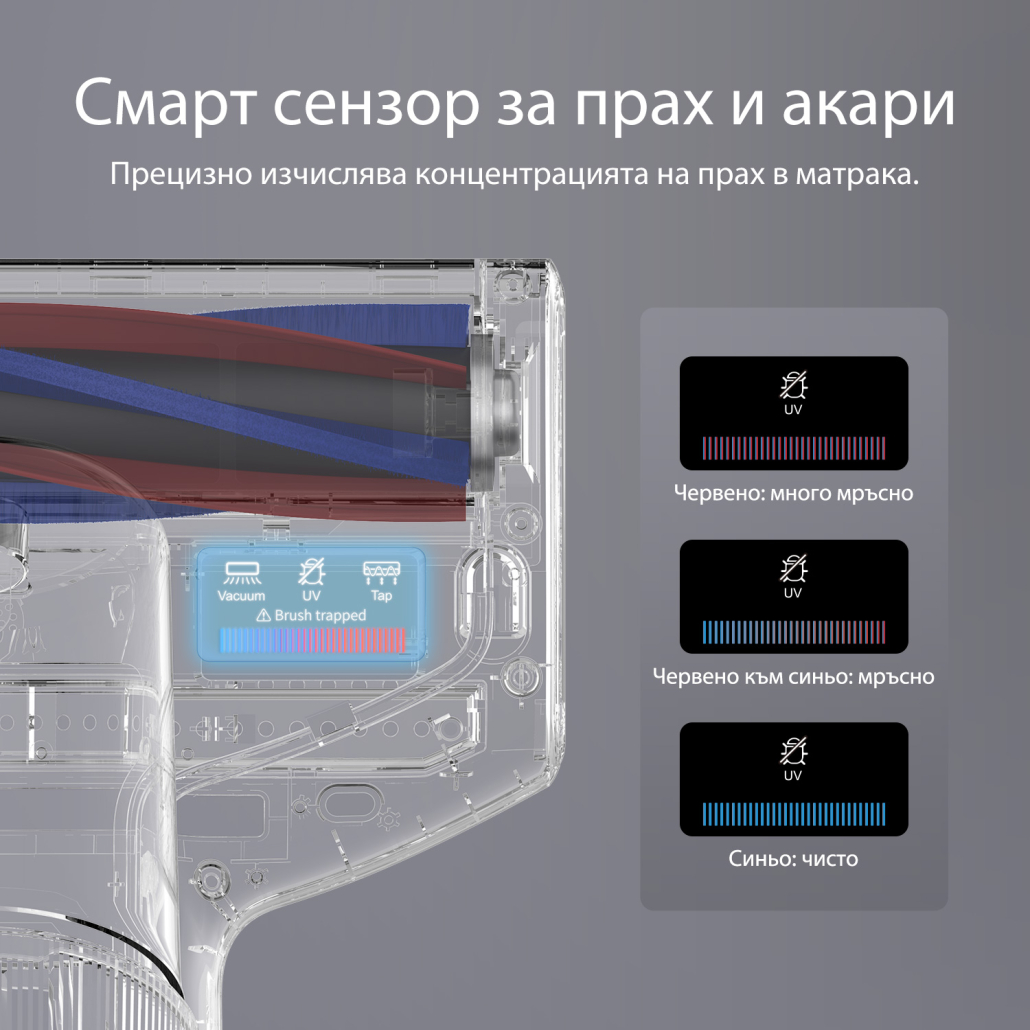 Интелигентният сензор изчислява с висока точност количеството прах и прахови акари в дадена зона. Червена светлина индикира високо замърсяване, а синята показва перфектно почистена повърхност.