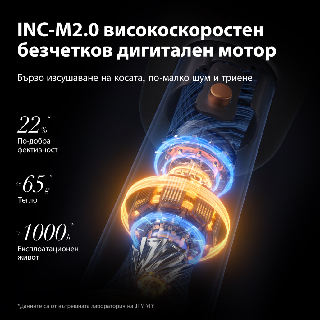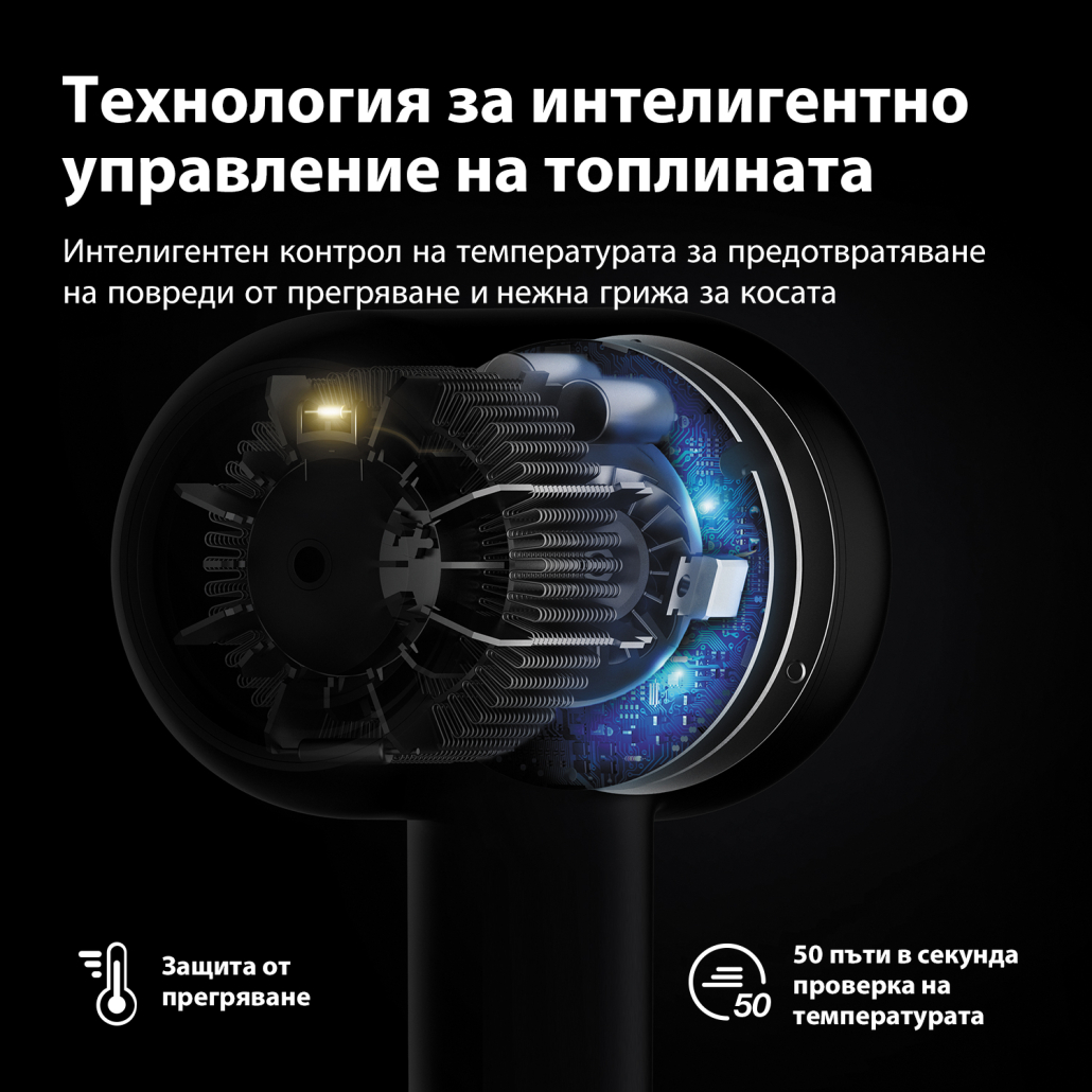 Ново поколение безчетков дигитален микромотор с 47% по-малък размер, по-леко тегло и по-дълъг експлоатационен живот. Задвижването на силен вятър достига директно до корените на косата, изсушавайки косата бързо, докато се грижи за косата.