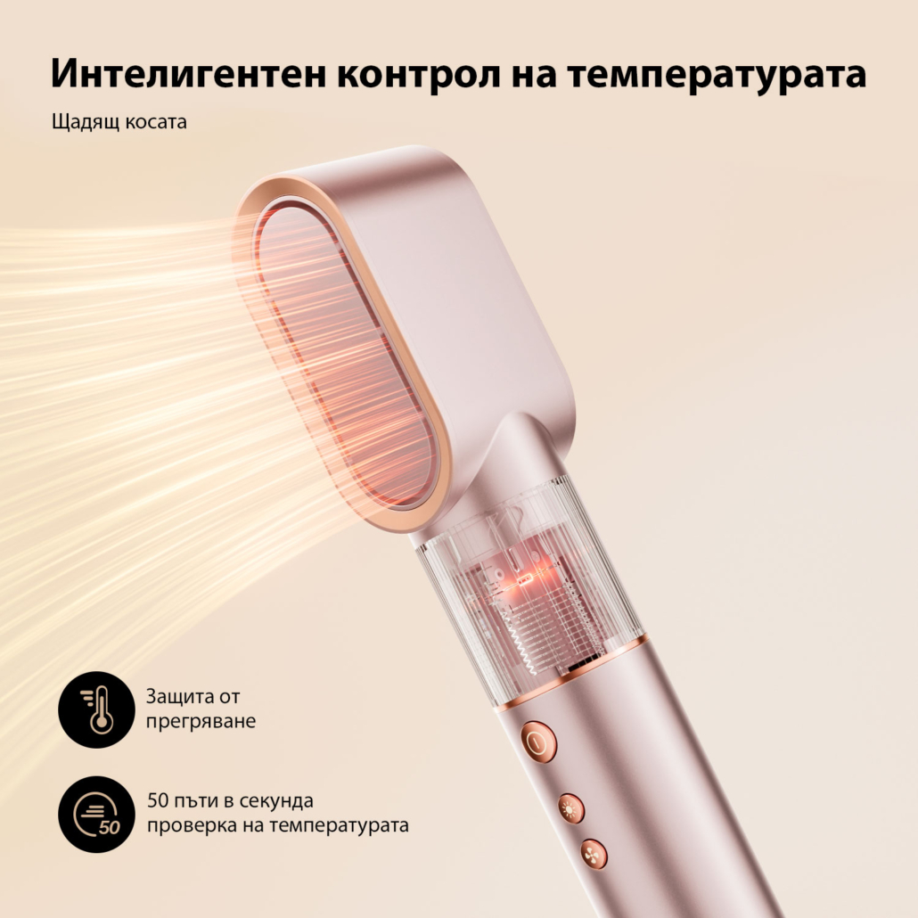 Интелигентната NTC технология следи температурата на въздушния поток 50 пъти в секунда и автоматично я регулира. Това помага да се намали рискът от прегряване на косата и прави сушенето по-балансирано и по-щадящо.