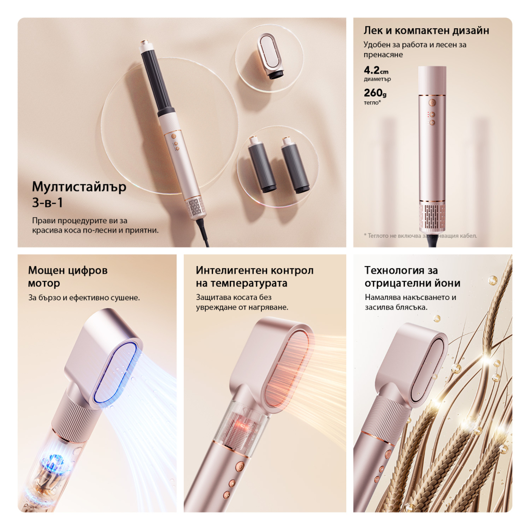 С диаметър от едва 3,2 см и тегло от 260 г, стайлърът е изключително удобен за захващане и използване, дори при продължителни сесии за оформяне.
