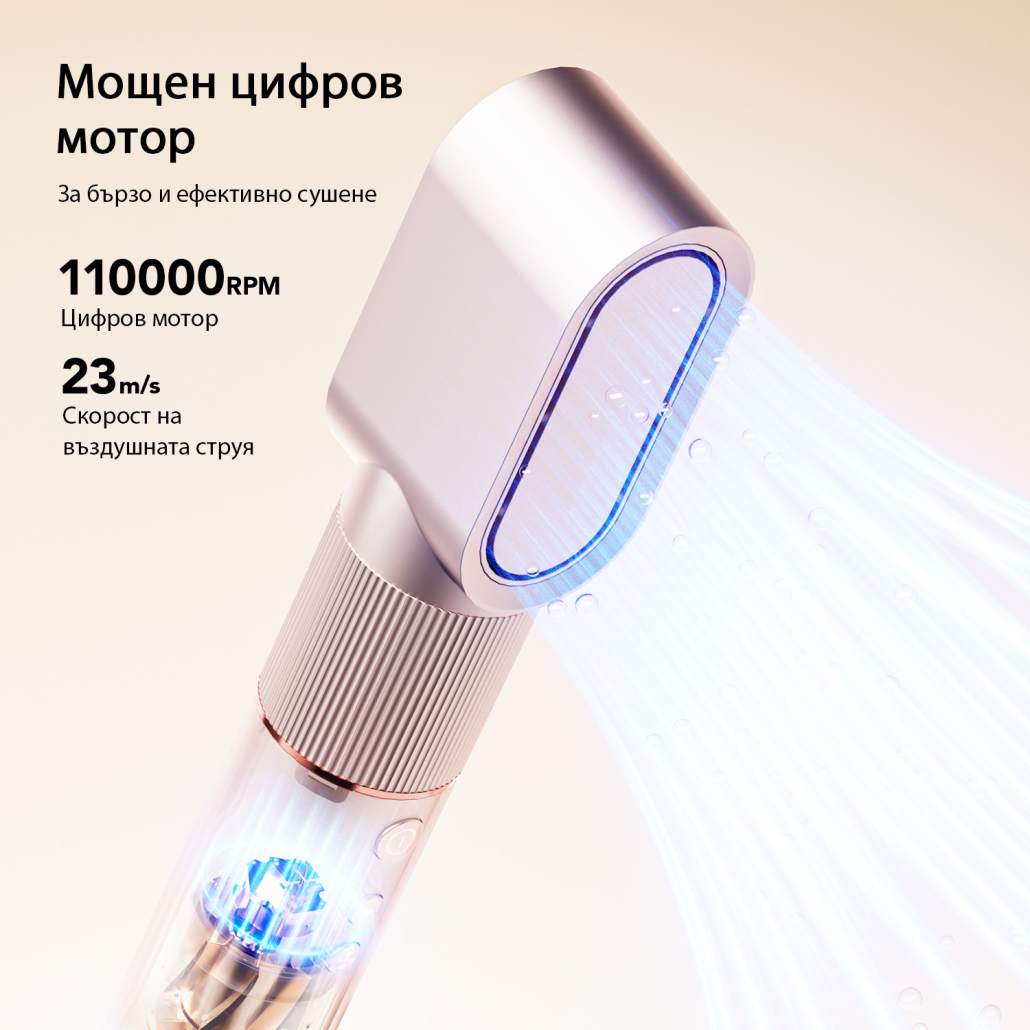 Със скорост от 110 000 оборота в минута, моторът на Jimmy HF9 генерира силна въздушна струя от 23 m/s, която изсушава косата бързо и ефективно, като същевременно защитава нейната структура.