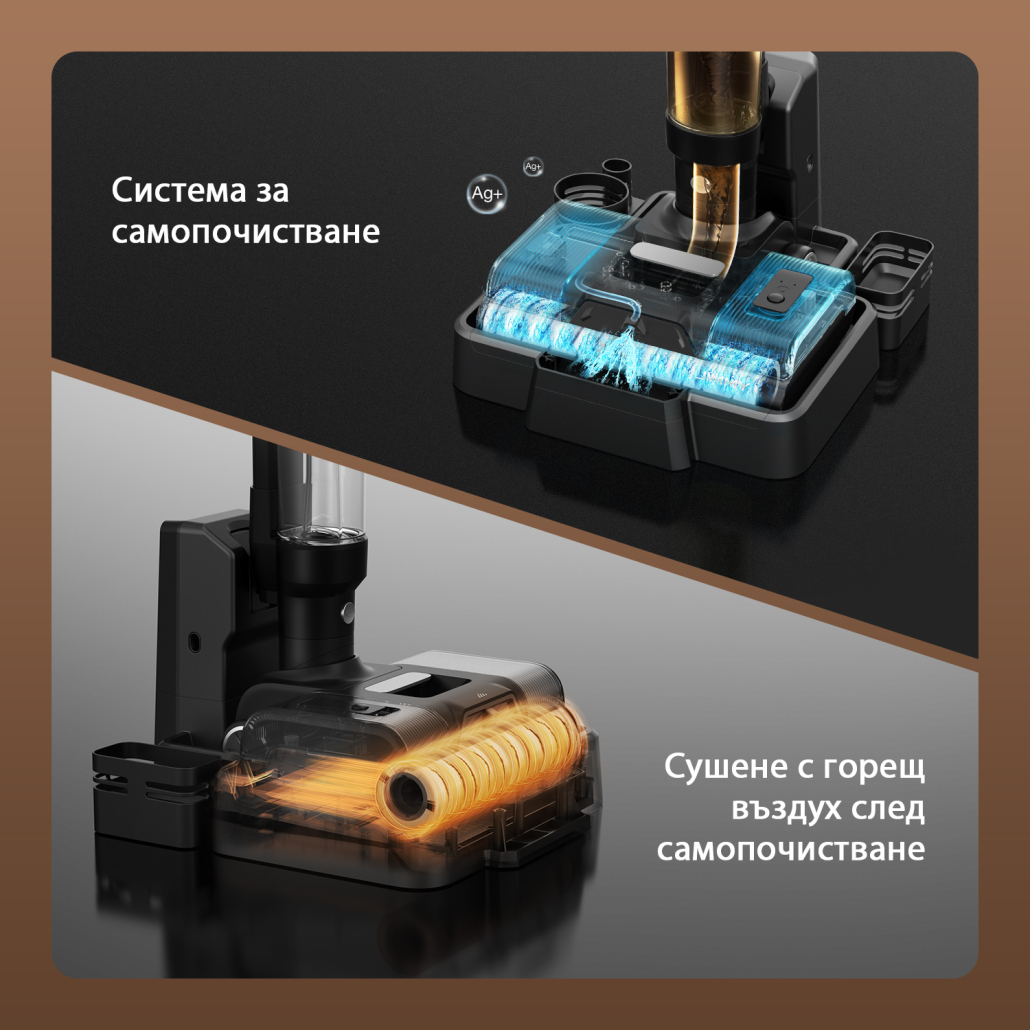 Въртящите се ролкови четки, въздушният път и резервоарът за мръсна вода се изсушават напълно с горещ въздух след самопочистване, за да се предотвратят появата на мухъл и неприятни миризми.