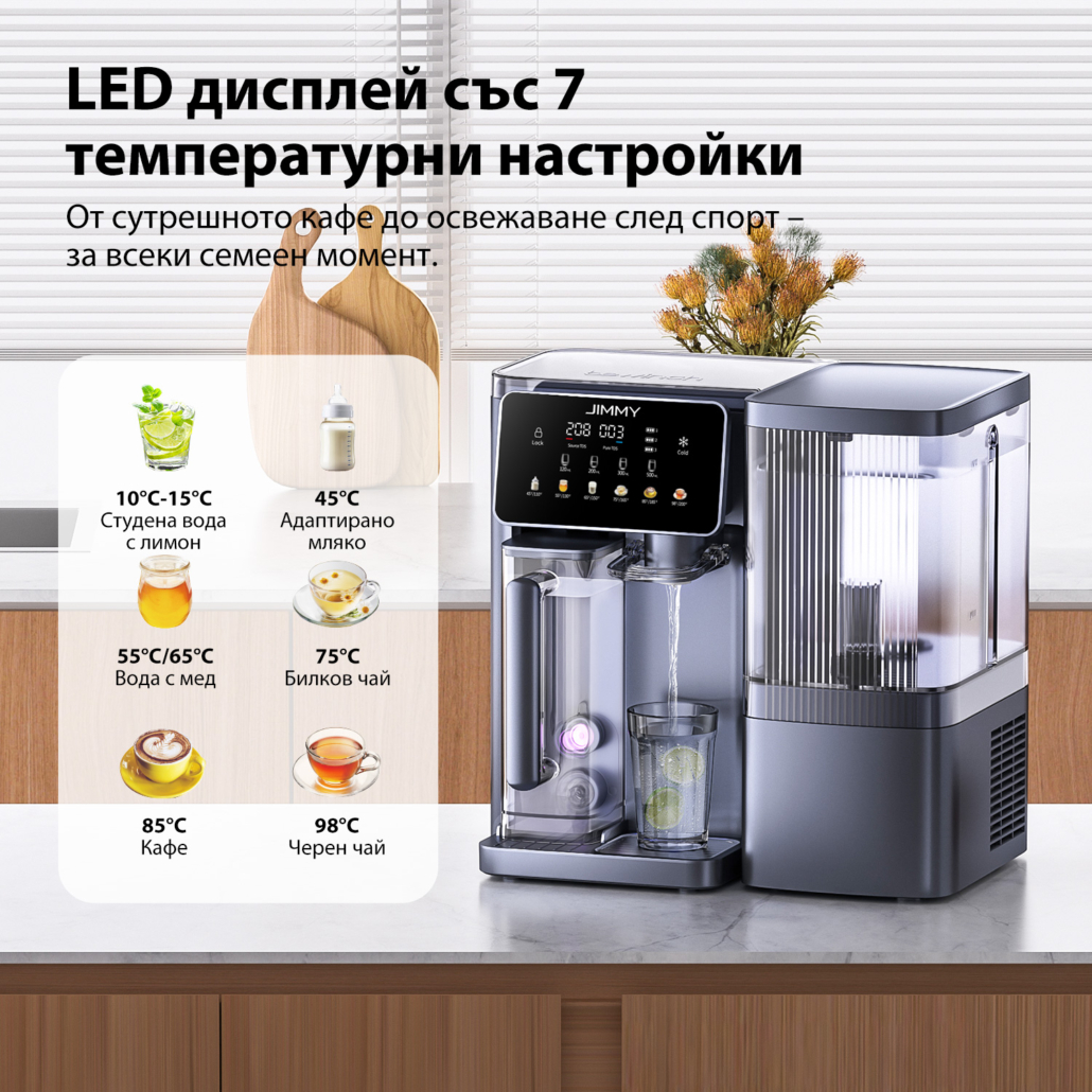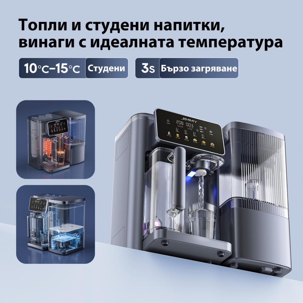 JIMMY R9 Pro е система от ново поколение за пречистване на вода, създадена за дома и офиса – осигурява топла, студена или вода със стайна температура без монтаж и без сложна инсталация. Получавате чиста вода с отличен вкус и възможност за избор на подходящата температура по всяко време.