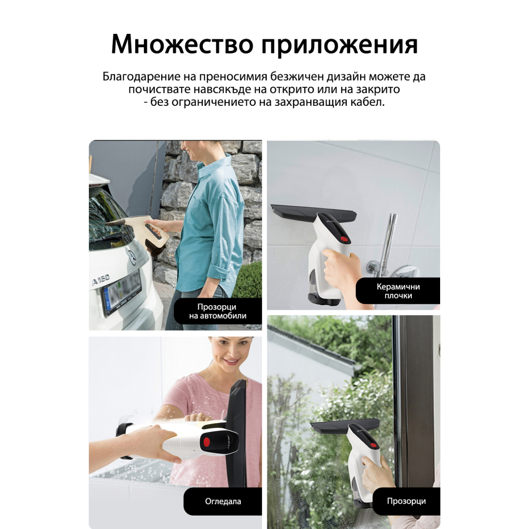 Jimmy VW302 е идеален не само за прозорци, но и за огледала, плочки, плотове и автомобилни стъкла. Почиства гладките повърхности с лекота и прецизност.